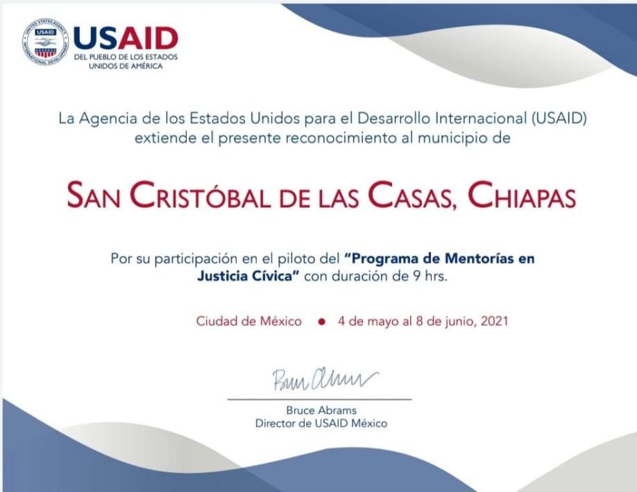 - La Dirección de Policía Municipal de San Cristóbal de Las Casas fue reconocida por la Agencia de los Estados Unidos para el Desarrollo Internacional por su destacada participación en el Programa de Mentorías en Justicia Cívica que imparte este organismo a nivel nacional