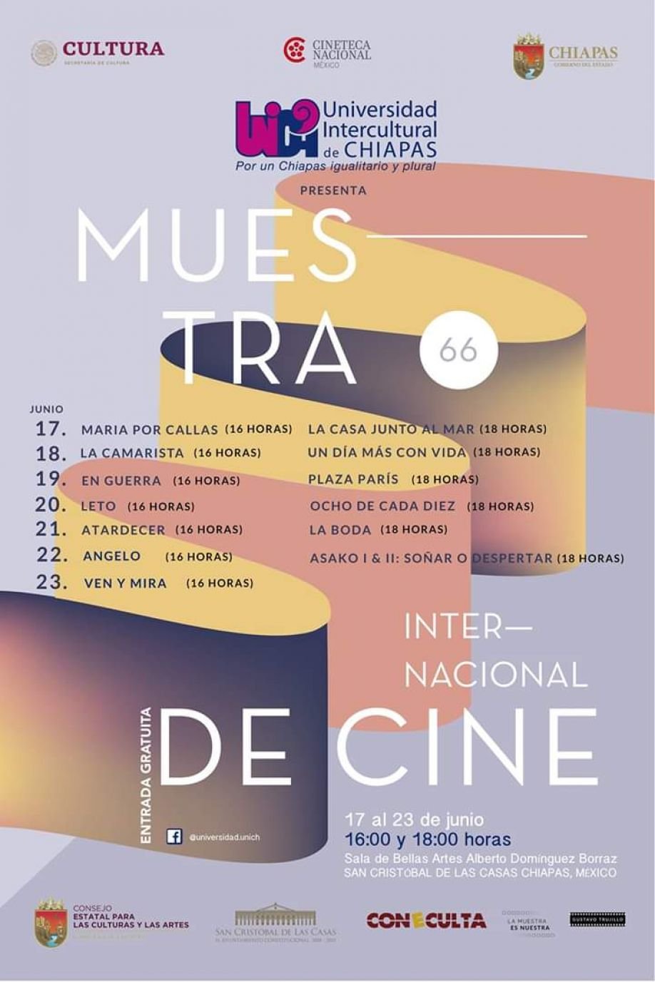 Luis Urbina Zepeda, Director del Centro Cultural de El Carmen de San Cristóbal, en representación La directora del Consejo Estatal para la Cultura y las Artes (Coneculta) Chiapas, Cecilia Flores Pérez inauguró la 66 Muestra Internacional de Cine de la Cineteca Nacional, organizado por la Universidad Intercultural de Chiapas (UNICH), el cual se desarrollará del 17 al 23 de junio en la Sala de Bellas Artes.