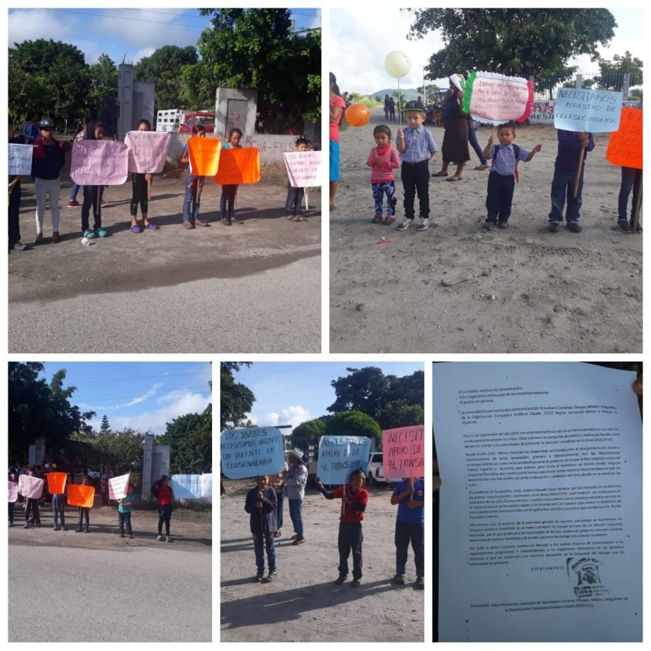 La mañana de este miércoles niños, niñas, jóvenes, madres y padres de familia se manifestaron para denunciar que desde el año 2016 han venido solicitando el otorgamiento de claves y construcciones de aulas (preescolar, primaria y telesecundaria) con las dependencias correspondientes así como en la Secretaría General de Gobierno en la que se han instalado mesas de trabajo pero hasta el momento no han tenido ninguna respuesta favorable.