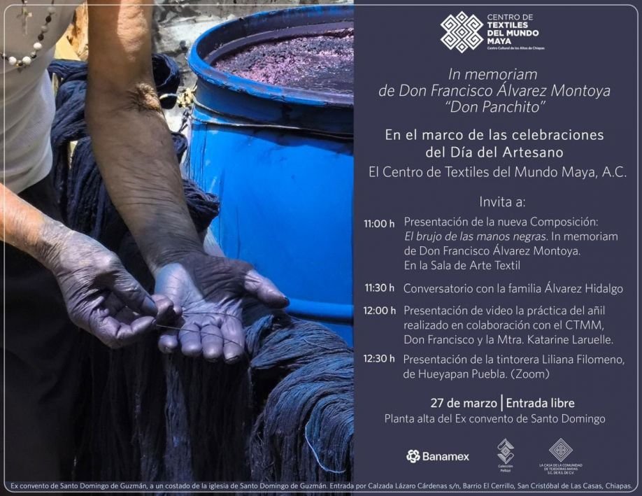 Como parte del homenaje, se presentará la composición “El brujo de las manos negras. In memoriam de Don Francisco Álvarez Montoya”, integrada por piezas teñidas con añil provenientes de distintos municipios de Chiapas y Guatemala.