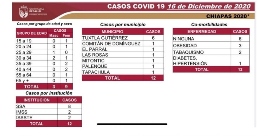 Tuxtla Gutiérrez, Chiapas; 16 de diciembre de 2020.- El Laboratorio Estatal de Salud Pública confirmó en las últimas horas 12 casos positivos de COVID-19, por lo que el balance actual de la pandemia asciende a 7 mil 210 contagios.
