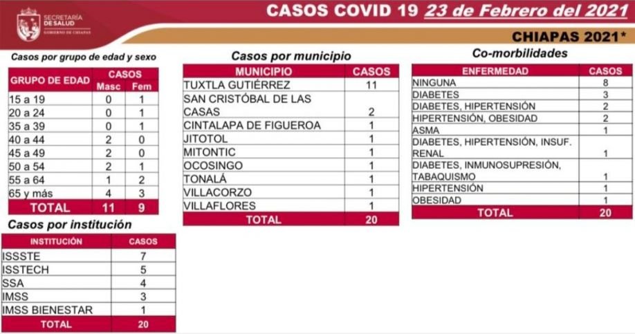 Tuxtla Gutiérrez, Chiapas; 23 de febrero de 2021.- La Secretaría de Salud del estado da a conocer que Chiapas acumula 20 casos nuevos y un deceso por la pandemia de COVID-19.