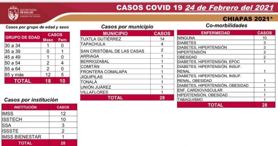 Tuxtla Gutiérrez, Chiapas; 24 de febrero de 2021.- La Secretaría de Salud del estado comunica el registro de 28 casos positivos de COVID-19 en las últimas horas.