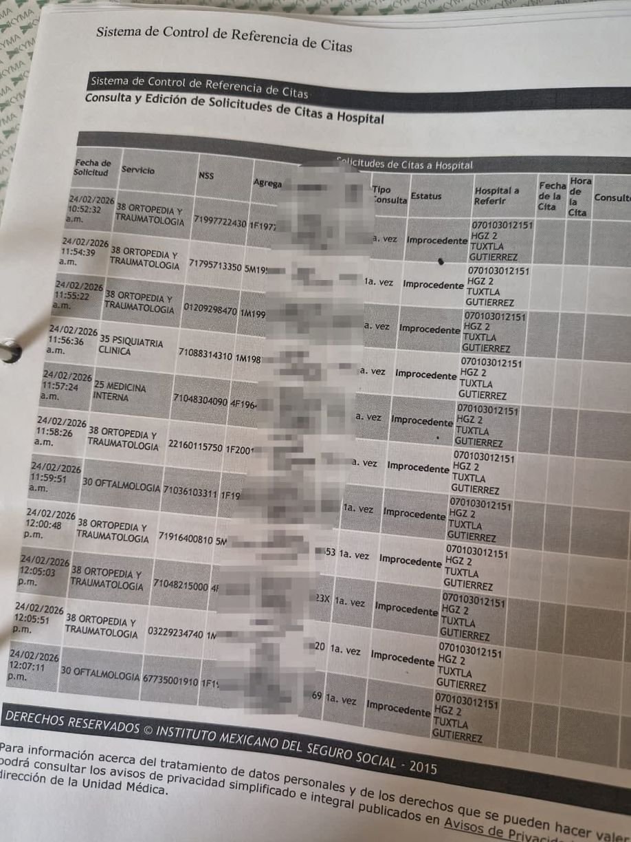 San Cristóbal de Las Casas, Chiapas.26 de febrero de 2026.- Trabajadores afiliados al Instituto Mexicano del Seguro Social denunciaron que desde enero de 2026 no se están otorgando citas en el área de Traumatología en la zona San Cristóbal–Tuxtla, situación que aseguran ha dejado a numerosos derechohabientes sin atención médica especializada ni seguimiento a sus tratamientos.