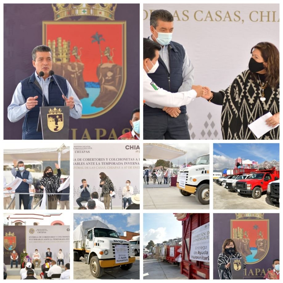 El gobernador del estado, Rutilio Escandón Cadenas encabezó el banderazo de salida de cobertores y colchonetas que serán entregadas a personas vulnerables de 25 municipios ante la temporada invernal 2021, acompañado por la alcaldesa de San Cristóbal de Las Casas, Jerónima Toledo Villalobos.