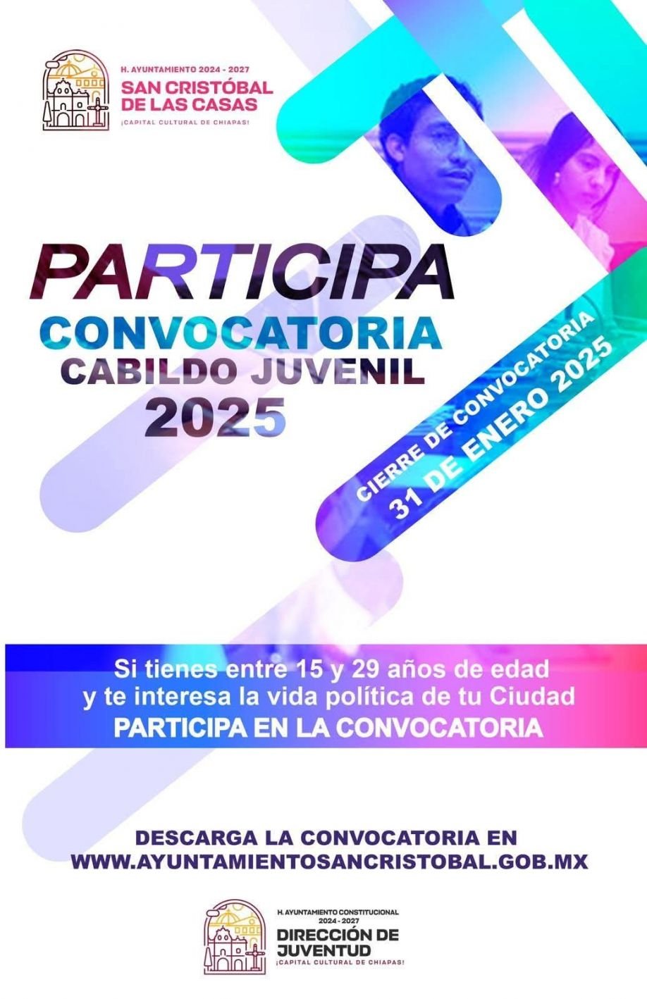 San Cristóbal de Las Casas, 20 de enero de 2025.- El H. Ayuntamiento de San Cristóbal de Las Casas, a través de la Dirección de Juventud, ha emitido la convocatoria para el “Cabildo Juvenil 2025”, un proyecto que busca promover la participación activa y democrática de los jóvenes en la creación de políticas públicas locales, fortaleciendo su liderazgo, conciencia ciudadana y compromiso social.