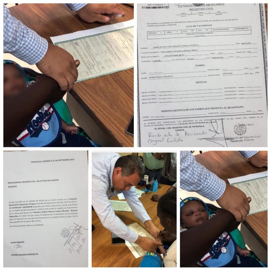 En cumplimiento al Artículo 47 del Reglamento del Registro Civil del Estado de Chiapas y al Artículo 30 de la Carta Magna, que establece que la nacionalidad mexicana se adquiere por nacimiento en territorio de la República Mexicana, este miércoles la Oficialía Número 3 del Registro Civil, con sede en Tapachula, llevó a cabo el registro de nacimiento de Andrés Manuel López Obrador Nsakala Miguelita, nombre con el que se le dio identidad al niño afromexicano, cuya madre vive temporalmente en el estado de Chiapas.