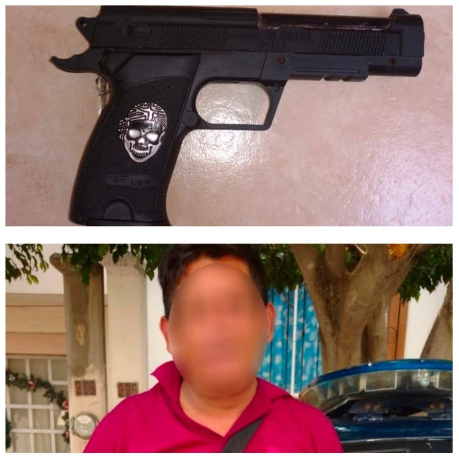 Al practicar una inspección de persona, de acuerdo con el artículo 268 del Código Nacional de Procedimientos Penales al detenido, se le encontró entre sus pertenencias una pistola de plástico con la que amagó a sus víctimas para despojarlos de tres botellas de licor, productos que fueron asegurados por los elementos.