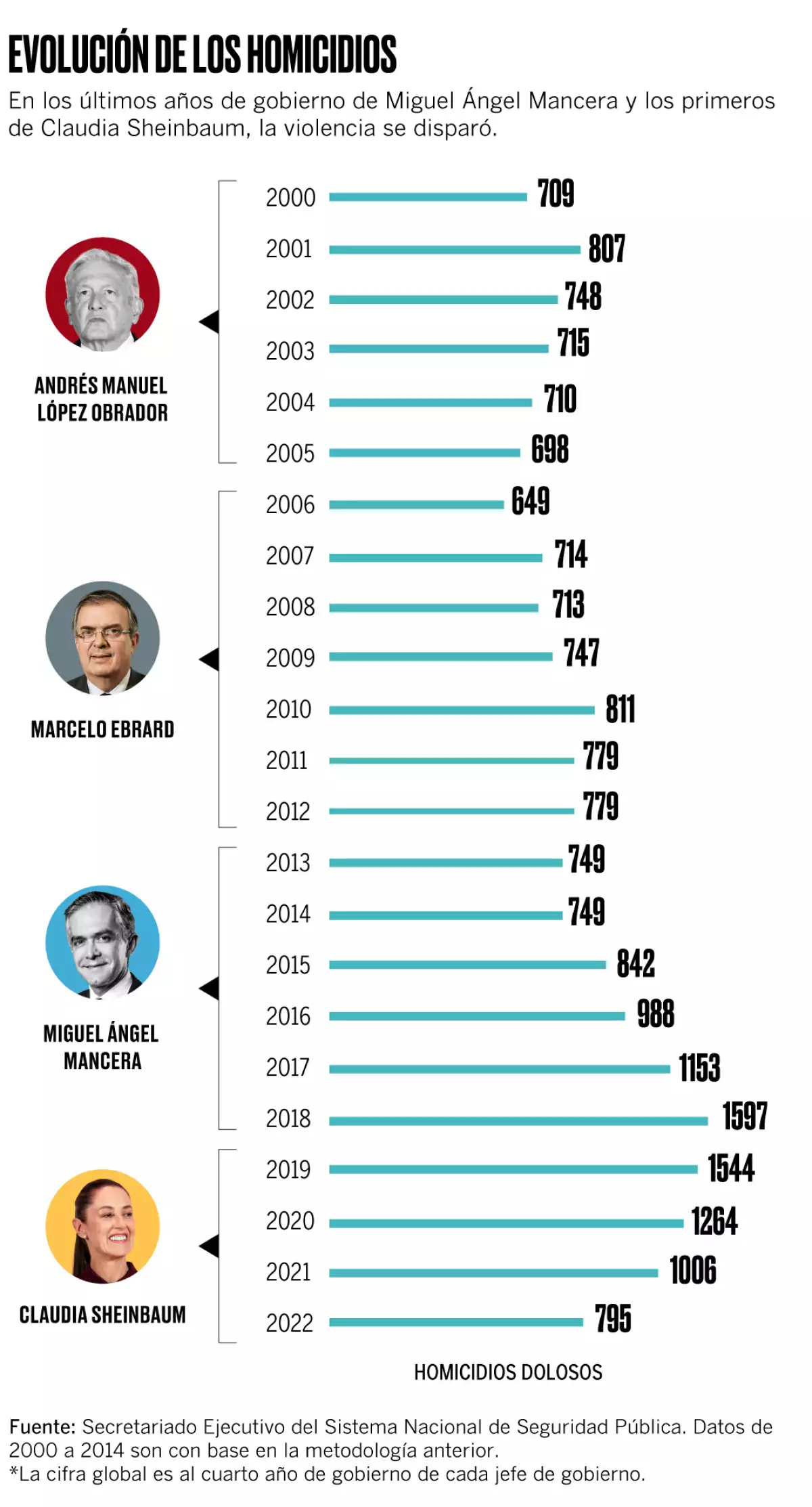 El primer año de gestión de Claudia se ubicó en 1,544 muertes violentas y a partir de ahí bajó. En 2022, ocurrieron 795. Mientras que el gobierno de Marcelo Ebrard abrió con 649 muertes en 2006 y cerró seis años más tarde en 779.