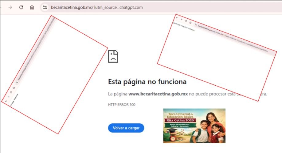 Durante el inicio del registro en línea para la Beca Rita Cetina Gutiérrez, destinada a estudiantes de primaria, usuarios reportaron dificultades para acceder al portal oficial (https://www.becaritacetina.gob.mx/). El sitio presentó mensajes de error como “503 – Service Unavailable” y “stream timeout" o "simplemente pagina no disponible”, lo que impide a varias familias completar el registro durante gran parte de la mañana y la tarde.