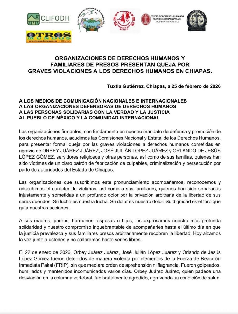 San Cristóbal de Las Casas, Chiapas.- 25 de febrero de 2026.— Organizaciones defensoras de derechos humanos y familiares de personas privadas de la libertad presentaron una queja formal ante la Comisión Nacional de los Derechos Humanos y la Comisión Estatal de los Derechos Humanos de Chiapas, por presuntas graves violaciones a derechos humanos cometidas en agravio de Orbey Juárez Juárez, José Julián López Juárez y Orlando de Jesús López Gómez, detenidos el pasado 22 de enero.