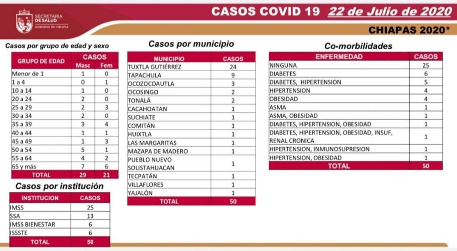 Al respecto, la dependencia estatal da a conocer que los casos recientes se presentaron de la siguiente manera: Tuxtla Gutiérrez, 24; Tapachula, nueve; Ocozocoautla, tres; Ocosingo y Tonalá, dos cada uno; y Cacahoatán, Suchiate, Comitán, Huixtla, Las Margaritas, Mazapa de Madero, Pueblo Nuevo Solistahuacán, Tecpatán, Villaflores y Yajalón, un caso cada municipio. Se trata de 29 hombres y 21 mujeres, entre ellos dos menores de edad y un bebé.
