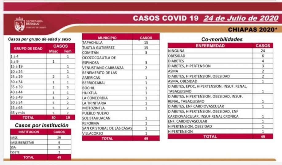 Tuxtla Gutiérrez, Chiapas; 24 de julio de 2020.- La Secretaría de Salud del estado confirmó 49 casos nuevos y seis defunciones de COVID-19 en las últimas horas, por lo que la cifra actual para Chiapas es de 5 mil 173 pacientes positivos y 421 decesos.