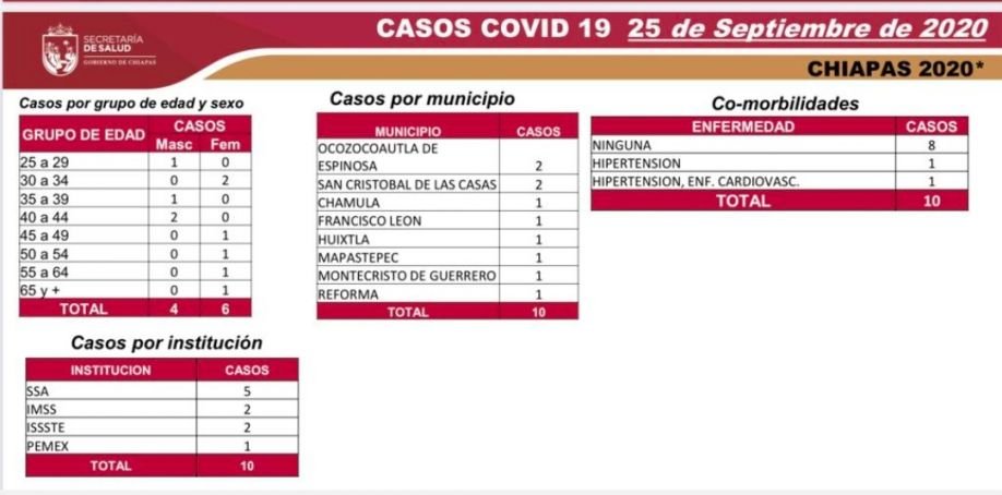 Los casos nuevos se presentaron en los siguientes municipios: Ocozocoautla y San Cristóbal de Las Casas, dos cada uno; y Francisco León, Huixtla, Chamula, Mapastepec, Montecristo de Guerrero y Reforma, un caso cada uno.