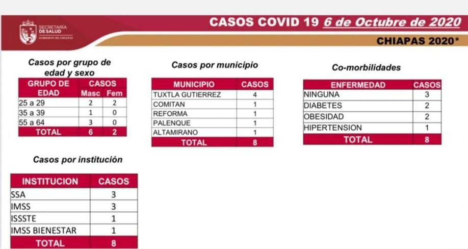 Los casos nuevos se distribuyen de la siguiente manera: Tuxtla Gutiérrez, cuatro; y Comitán, Reforma, Palenque y Altamirano, un caso cada municipio. Se trata de seis hombres y dos mujeres, cuya edad oscila entre los 25 y 64 años. De ellos, cinco tienen datos de co-morbilidad: dos presentan diabetes, otros dos cursan con obesidad y uno tiene antecedentes de hipertensión.