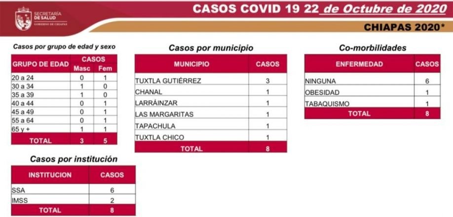 Tuxtla Gutiérrez, Chiapas; 22 de octubre de 2020.- En el informe diario sobre la incidencia de COVID-19 en la entidad, la Secretaría de Salud de Chiapas comunica que en las últimas horas se registraron ocho casos positivos y una defunción.