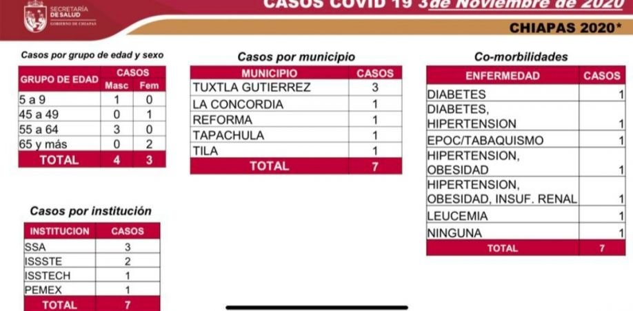 Los casos nuevos se distribuyen de la siguiente manera: Tuxtla Gutiérrez, tres; y La Concordia, Reforma, Tapachula y Tila, un caso cada municipio. Se trata de cuatro hombres, entre ellos un menor de edad, y tres mujeres.