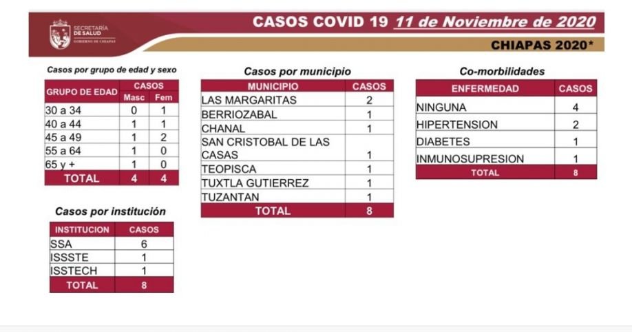 La dependencia estatal informa que los casos nuevos se presentaron de la siguiente manera: Las Margaritas, dos; y Berriozábal, Chanal, San Cristóbal de Las Casas, Teopisca, Tuxtla Gutiérrez y Tuzantán, un caso cada municipio.