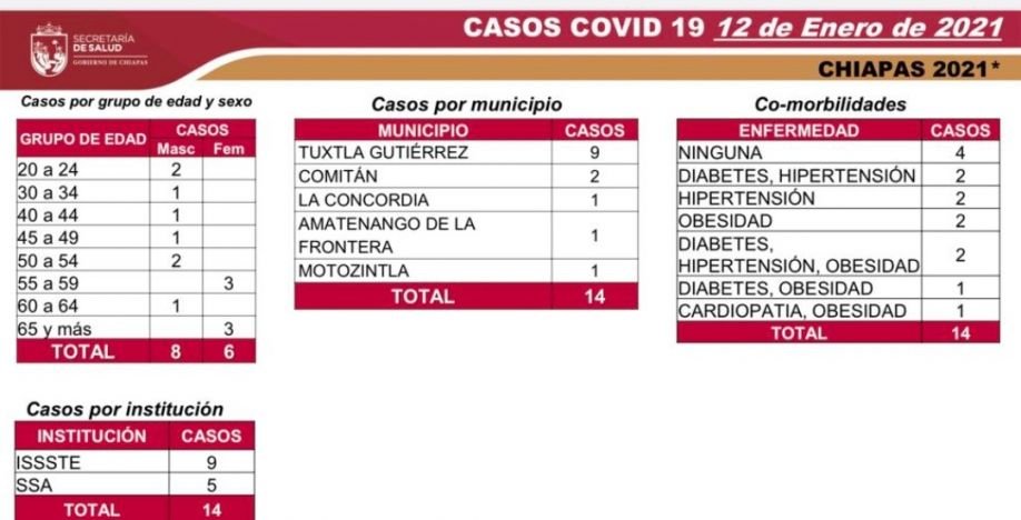 La dependencia estatal da a conocer que los casos recientes se presentaron de la siguiente manera: Tuxtla Gutiérrez, nueve; Comitán, dos; y Amatenango de la Frontera, La Concordia y Motozintla, un contagio cada municipio.