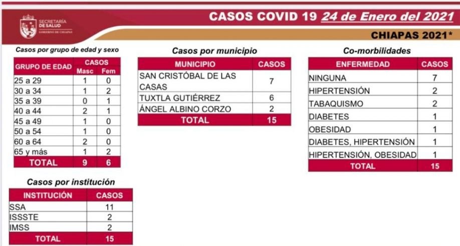 Los contagios recientes se reportaron en los municipios siguientes: San Cristóbal de Las Casas, siete; Tuxtla Gutiérrez, seis; y Ángel Albino Corzo, dos.