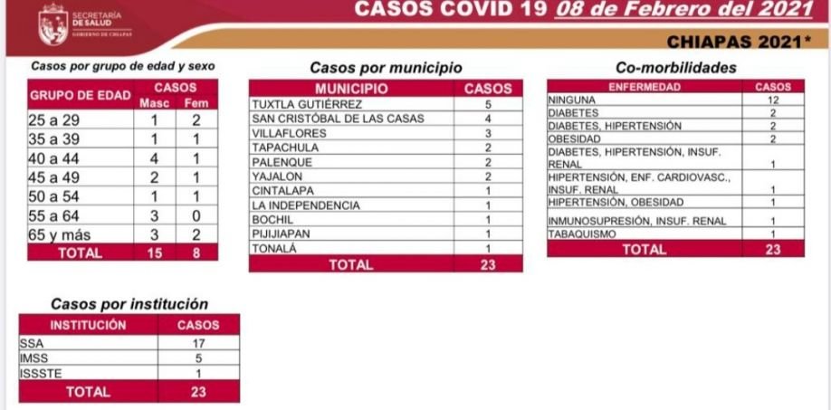Los casos nuevos se presentaron en 15 hombres y ocho mujeres, mayores de 25 años, en los siguientes municipios: Tuxtla Gutiérrez, cinco; San Cristóbal de Las Casas, cuatro; Villaflores, tres; Palenque, Tapachula y Yajalón, dos cada uno; y Bochil, Cintalapa, La Independencia, Pijijiapan y Tonalá, un caso cada uno.