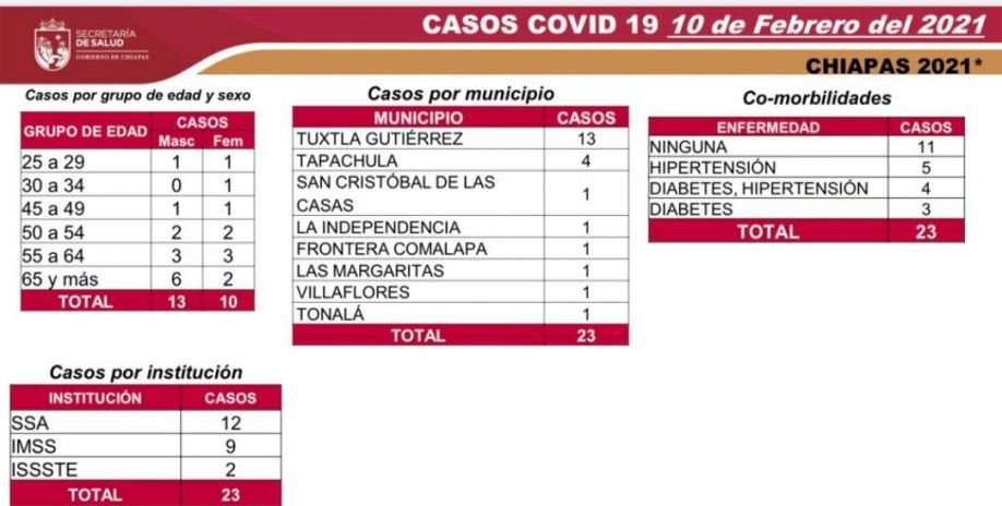 Los municipios que reportaron positividad en las últimas horas son: Tuxtla Gutiérrez, con 13 casos; Tapachula, cuatro; y Frontera Comalapa, La Independencia, Las Margaritas, San Cristóbal de Las Casas, Tonalá y Villaflores, un caso cada uno.